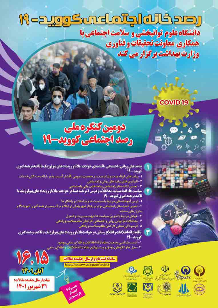دومین کنگره ملی رصد اجتماعی کووید 19، به همت رصدخانه اجتماعی کووید 19 و دانشگاه علوم توانبخشی و سلامت اجتماعی، و با حمایت معاونت تحقیقات و فناوری وزارت بهداشت، درمان و آموزش پزشکی طی روزهای 15 و 16 آبان ماه امسال برگزار می شود.